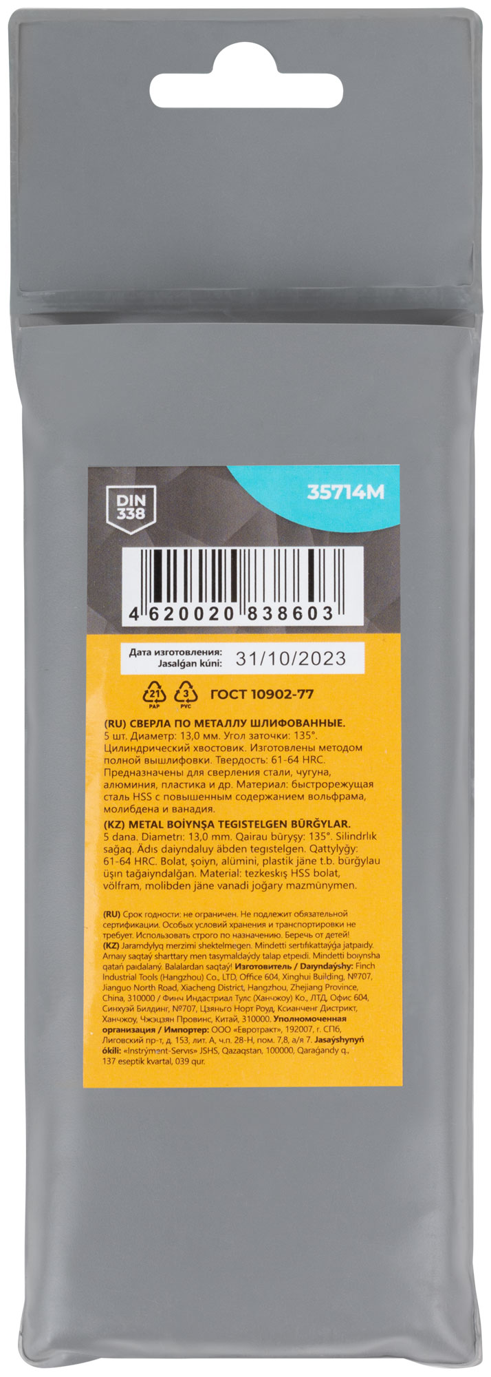 Сверла по металлу HSS шлифованные, угол заточки 135°, 13,0 x 151 мм (5 шт.)