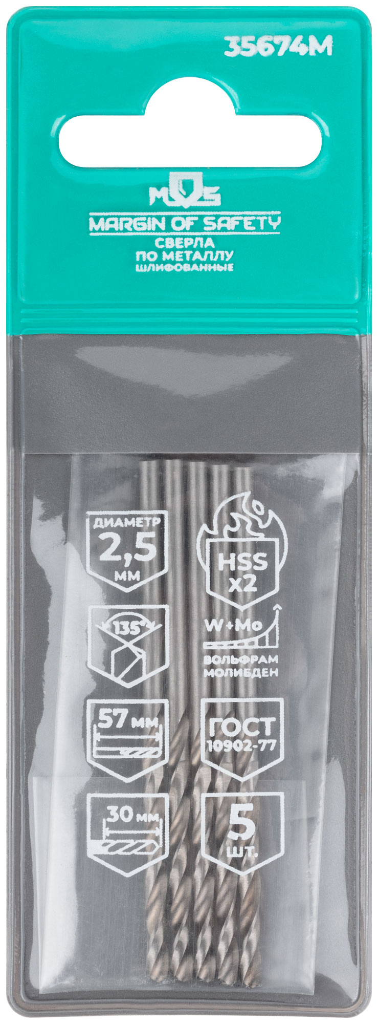 Сверла по металлу HSS шлифованные, угол заточки 135°, 2.5 x 57 мм (5 шт.)