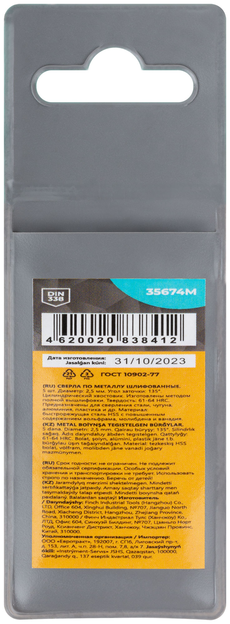 DIN338. Цилиндрический хвостовик.Изготовленно методом полной вышлифовки. Угол заточки 135°. Твердость: 61-64HRC. Материал: быстрорежущая сталь с повышенным содержанием вольфрама, молибдена и ванадия. Упаковка: пакет с подвесом.