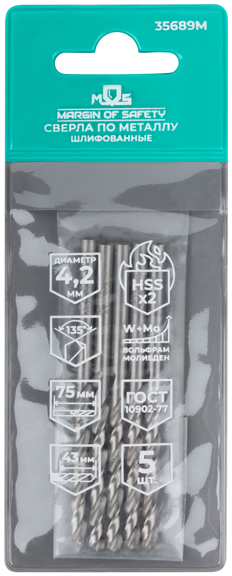 Сверла по металлу HSS шлифованные, угол заточки 135°, 4,2 x 75 мм (5 шт.)