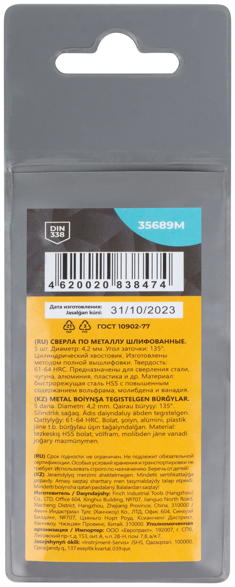 DIN338. Цилиндрический хвостовик.Изготовленно методом полной вышлифовки. Угол заточки 135°. Твердость: 61-64HRC. Материал: быстрорежущая сталь с повышенным содержанием вольфрама, молибдена и ванадия. Упаковка: пакет с подвесом.