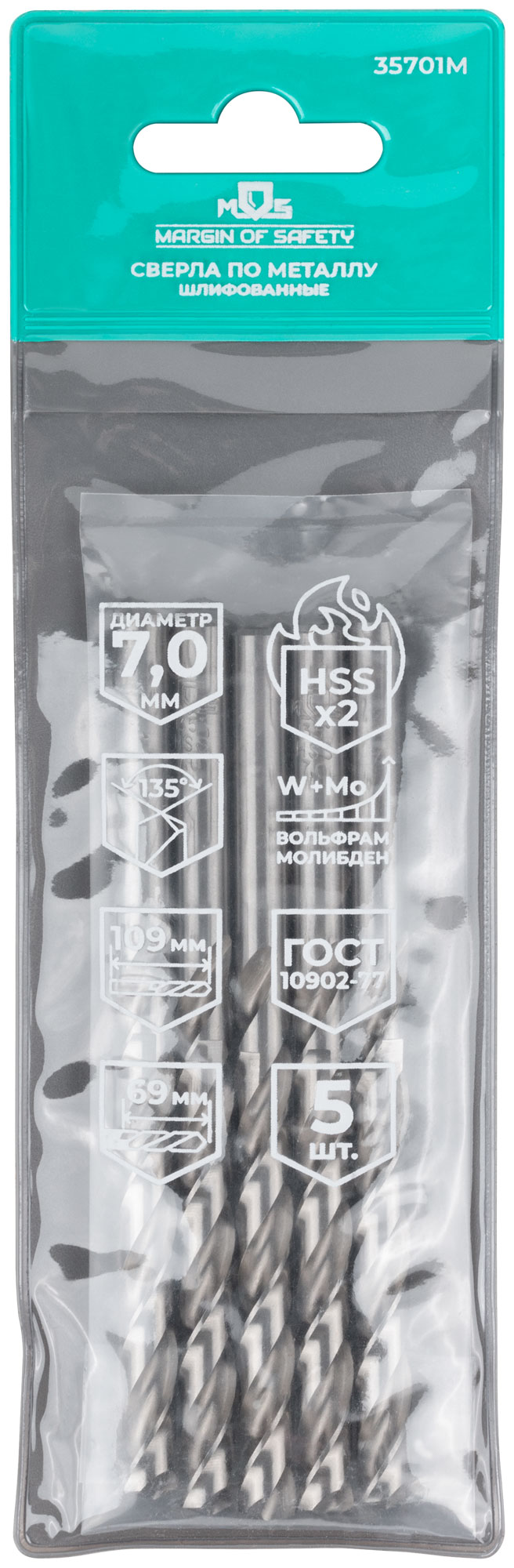 Сверла по металлу HSS шлифованные, угол заточки 135°, 7,0 x 109 мм (5 шт.)