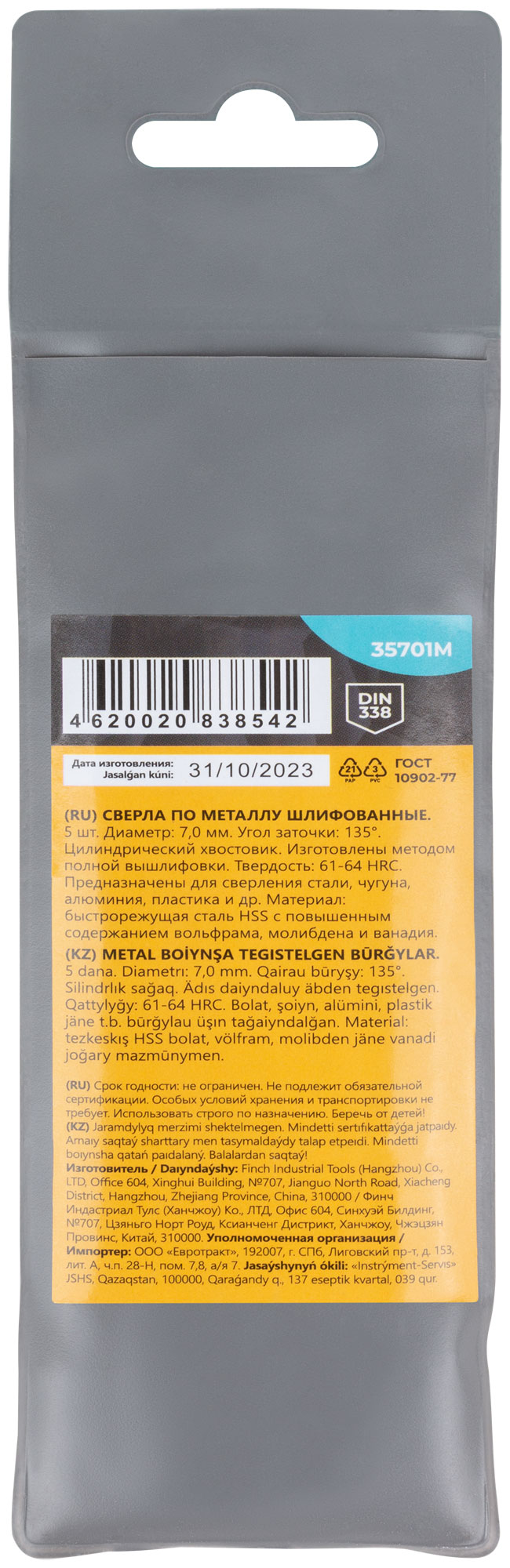 DIN338. Цилиндрический хвостовик.Изготовленно методом полной вышлифовки. Угол заточки 135°. Твердость: 61-64HRC. Материал: быстрорежущая сталь с повышенным содержанием вольфрама, молибдена и ванадия. Упаковка: пакет с подвесом.