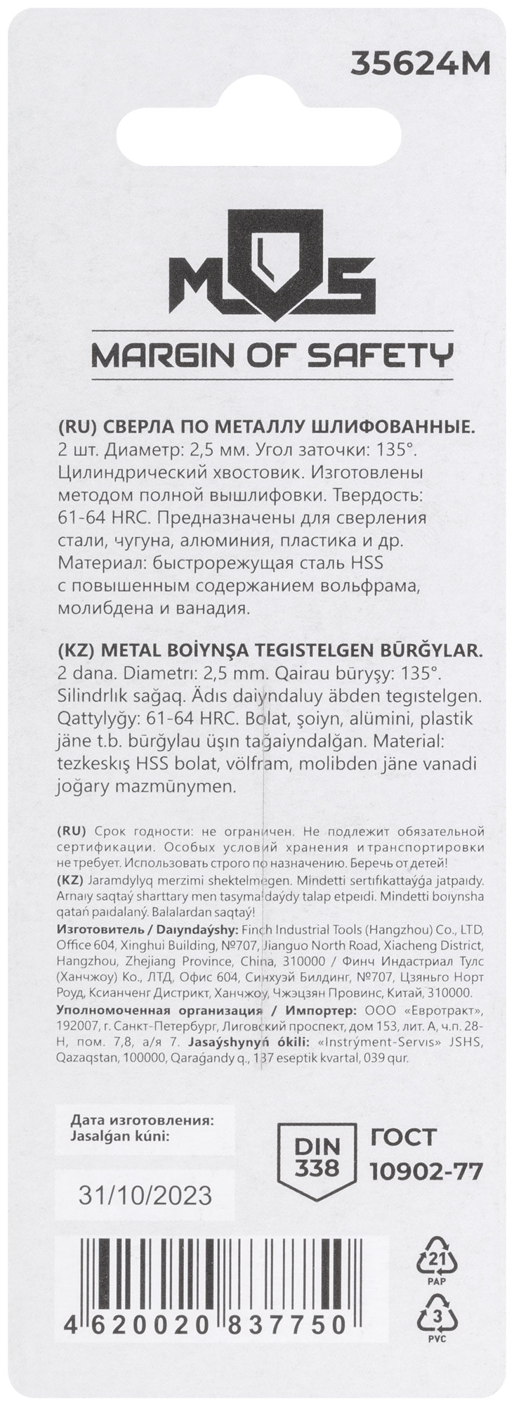 DIN338. Цилиндрический хвостовик. Изготовленно методом полной вышлифовки. Угол заточки 135°. Твердость: 61-64HRC. Материал: быстрорежущая сталь с повышенным содержанием вольфрама, молибдена и ванадия. Упаковка: блистер.