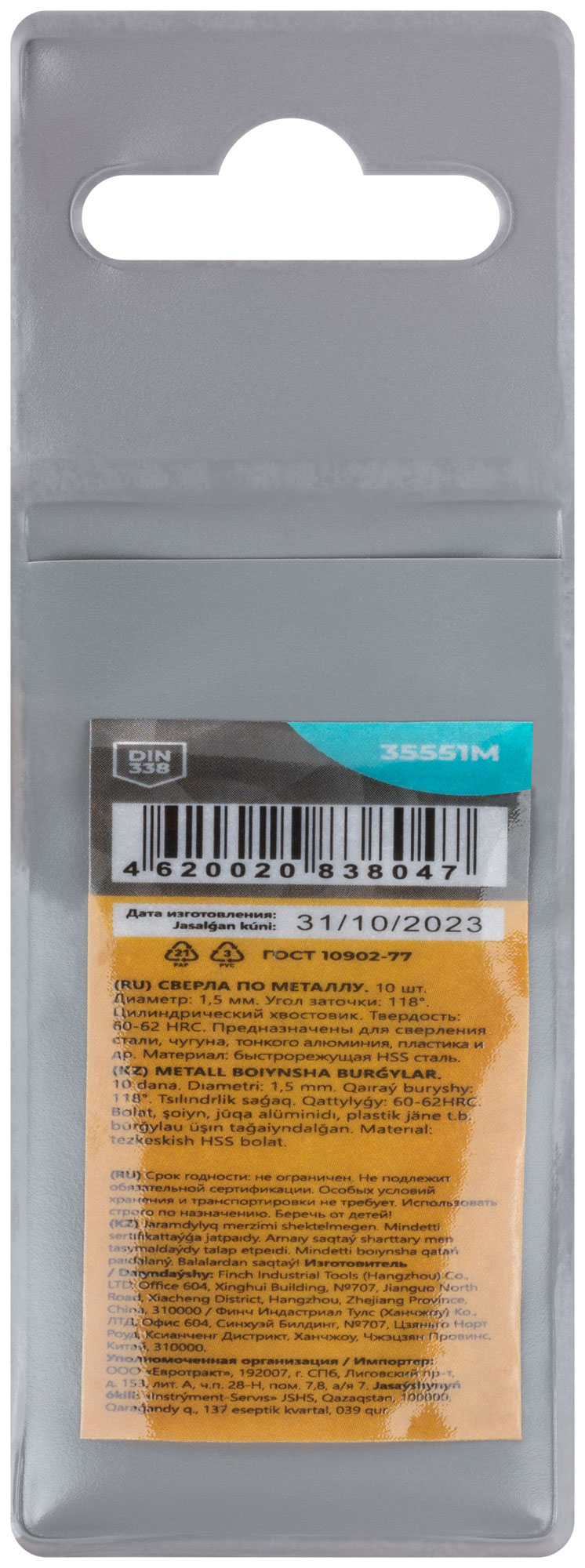DIN338. Цилиндрический хвостовик. Шлифованная кромка. Угол заточки 118°. Твердость: 60-62HRC. Материал: быстрорежущая сталь HSS4241. Упаковка: пакет с подвесом.