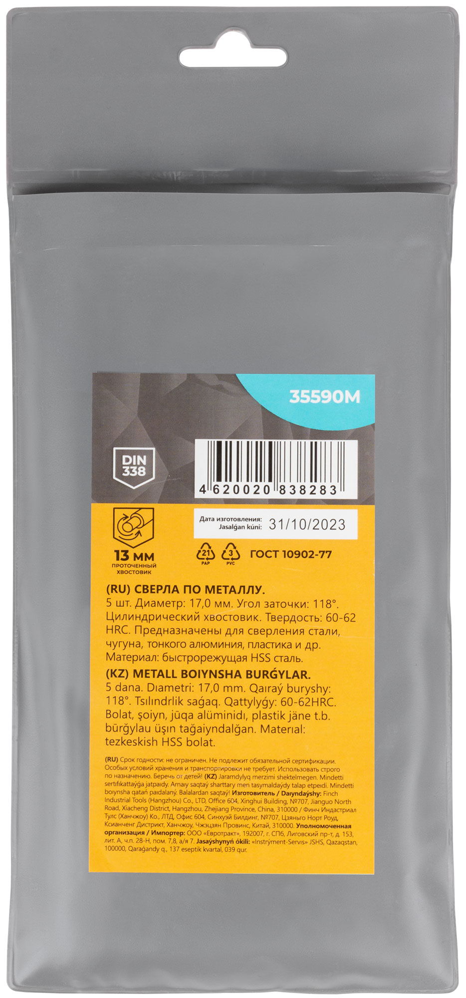 DIN338. Цилиндрический хвостовик. Шлифованная кромка. Угол заточки 118°. Твердость: 60-62HRC. Материал: быстрорежущая сталь HSS4241. Упаковка: пакет с подвесом.