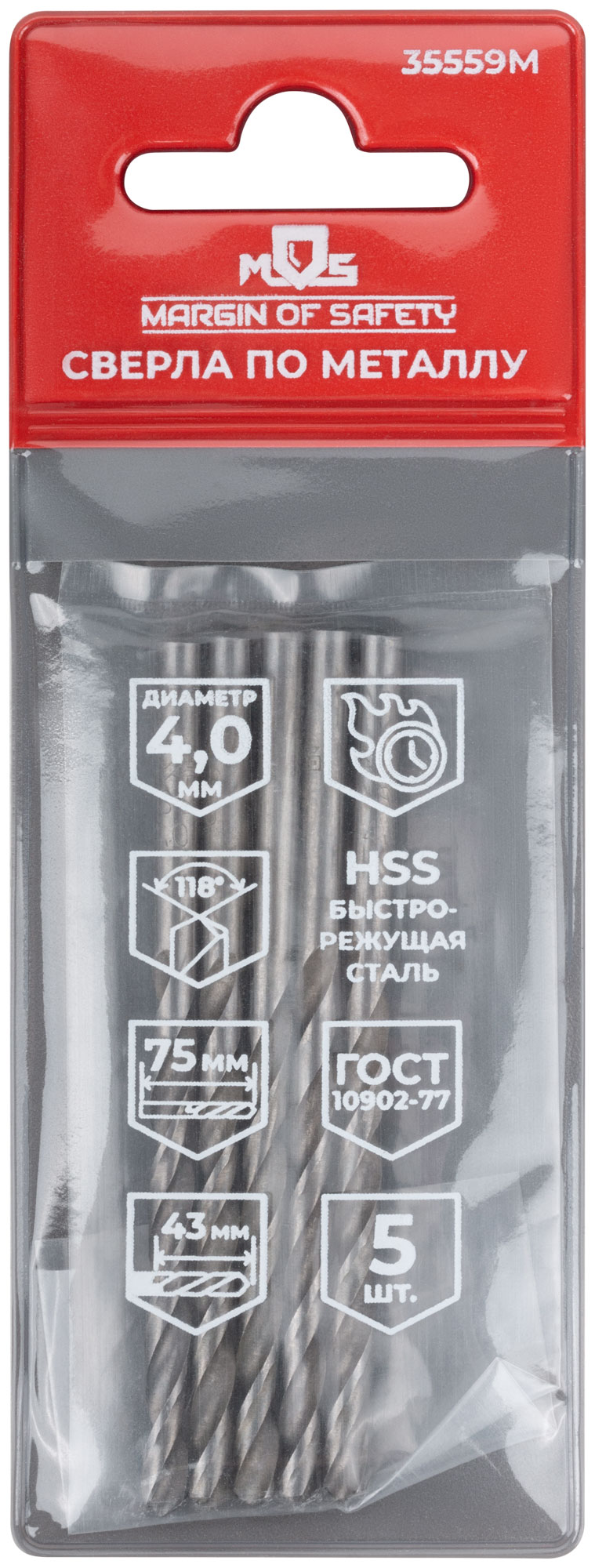 Сверла по металлу HSS, угол заточки 118°, 4,0 x 75 мм, (5 шт.)