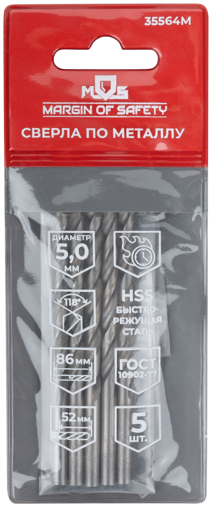 Сверла по металлу HSS, угол заточки 118°, 5,0 x 86 мм, (5 шт.)