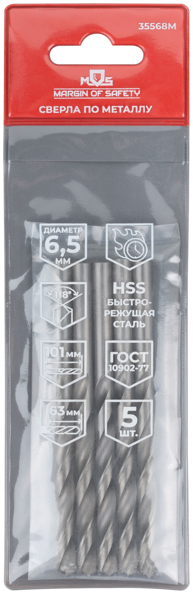 Сверла по металлу HSS, угол заточки 118°, 6,5 x 101 мм, (5 шт.)