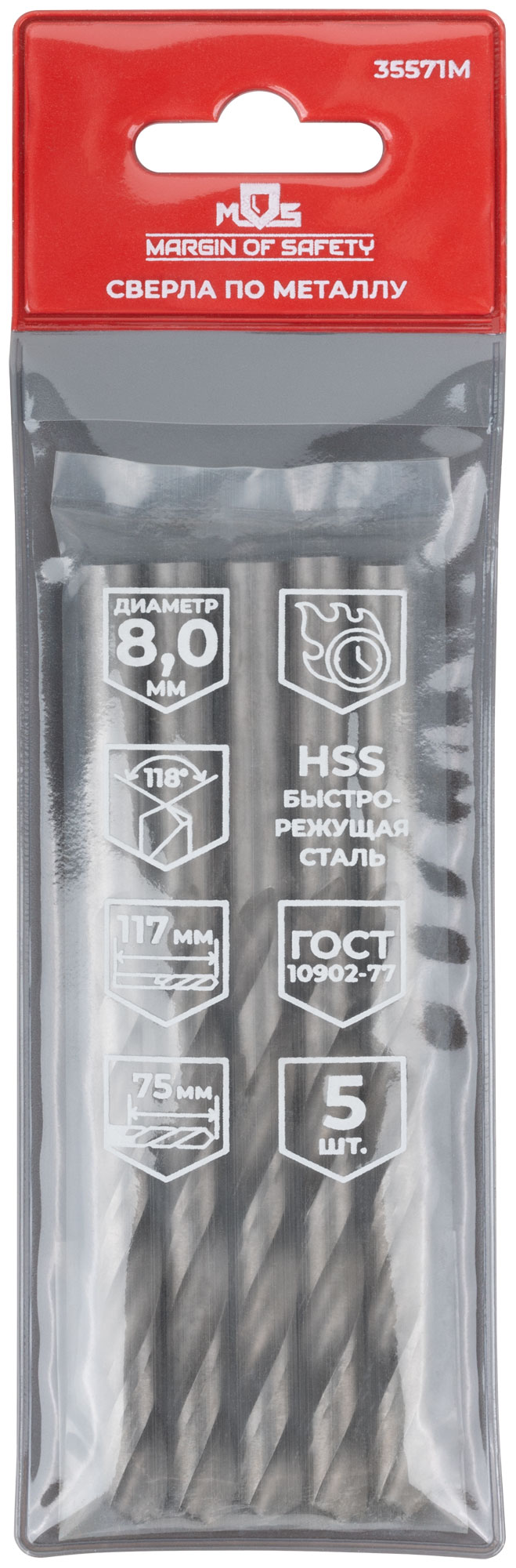 Сверла по металлу HSS, угол заточки 118°, 8,0 x 117 мм, (5 шт.)