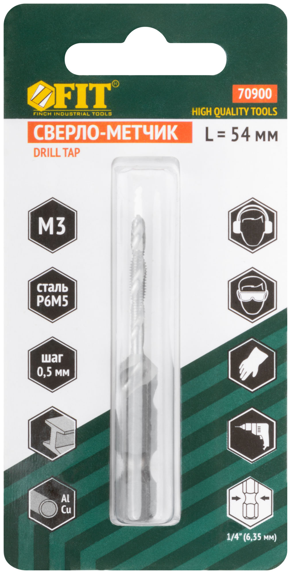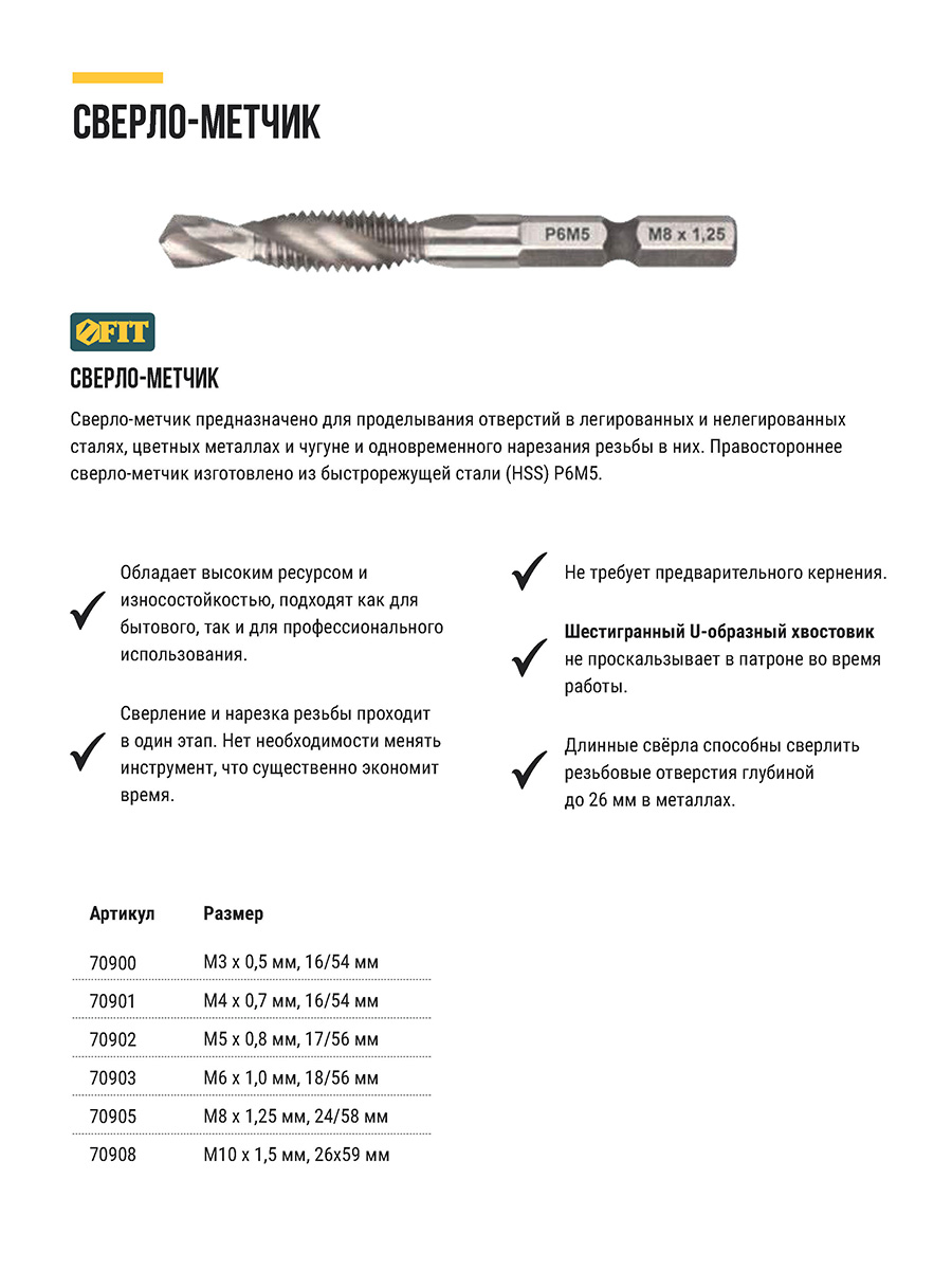 Для сверления отверстий и нарезания резьбы в легированных и нелигированных сталях, цветных металлах и чугуне. Шлифованный профиль, правостороннее, метрическая резьба. Шестигранный U-образный хвостик. Материал: быстрорежущая (HSS) сталь P6M5. Упаковка : блистер.