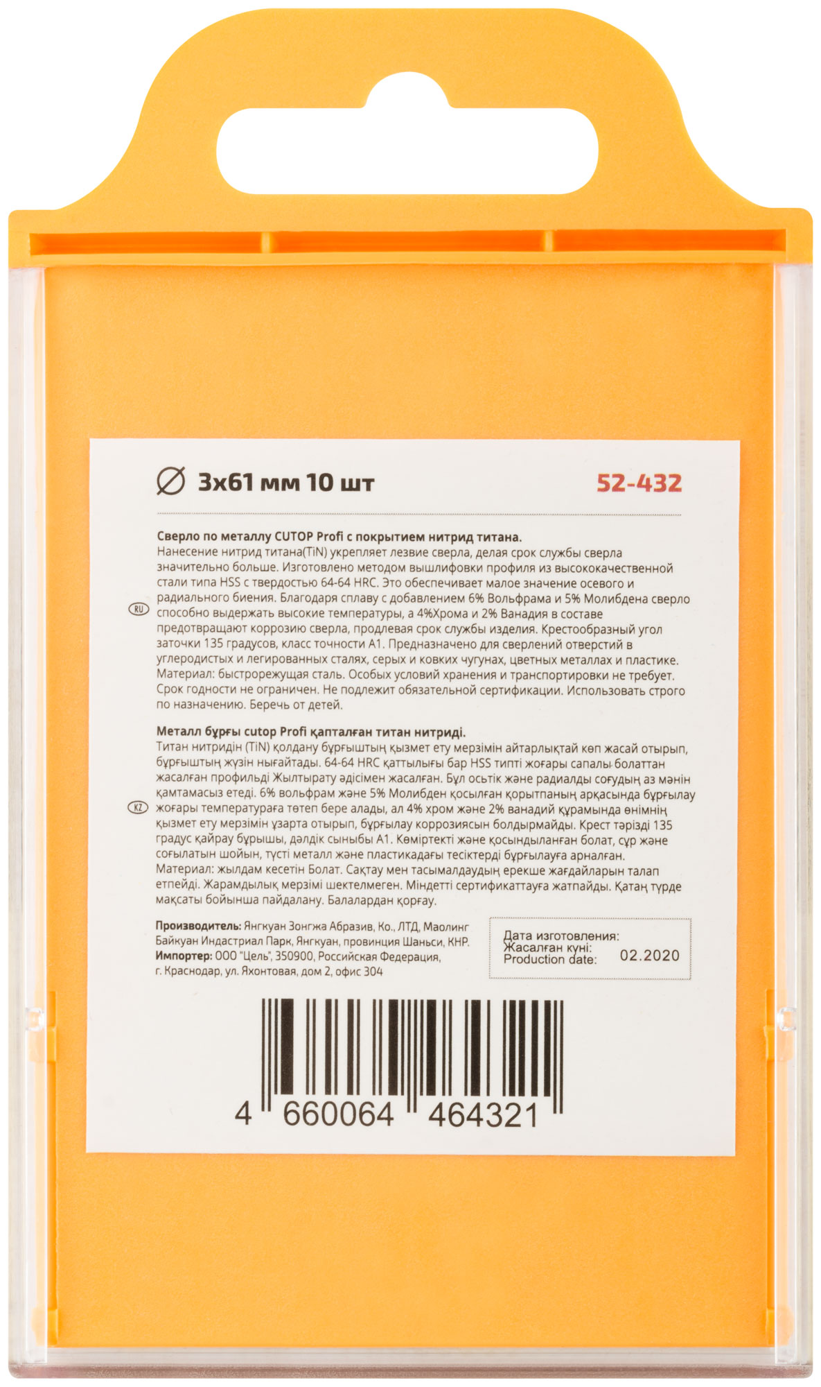 Нанесение нитрид титана(TiN) укрепляет лезвие сверла, делая срок службы сверла значительно больше. Изготовлено методом вышлифовки профиля из высококачественной стали типа HSS с твердостью 64-64 HRC. Это обеспечивает малое значение осевого и радиального биения. Благодаря сплаву с добавлением 6% Вольфрама и 5% Молибдена сверло способно выдержать высокие температуры, а 4% Хрома и 2% Ванадия в составе предотвращают коррозию сверла, продлевая срок службы изделия. Крестообразный угол заточки 135°, класс точности А1. Предназначено для сверлений отверстий в углеродистых и легированных сталях, серых и ковких чугунах, цветных металлах и пластике. Материал: быстрорежущая сталь. Упаковка: подвесной пластиковый бокс.пластиковый бокс.