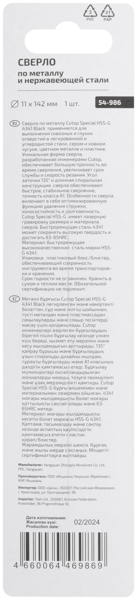 Сверло по металлу HSS-G Cutop Special применяется для выполнения сквозных/глухих отверстий в металлических заготовках: легированная и углеродистая сталь, серый и ковкий чугун, цветной металл и пластик. Цилиндрический хвостовик у сверл диаметром от 2мм до 5,5мм. Трехгранный хвостовик у сверл диаметром от 6мм до 13мм. Угол заточки 135°, класс точности А1 и длинная спиральная конструкция сверла обеспечивают быстрое, стабильное сверление. Сверла HSS-G имеют повышенную твердость благодаря полной шлифовки режущей поверхности нитридом бора. Это обеспечивает высокое качество обработки стенок отверстий. Лазерная маркировка размера и материала сверла. Материал: быстрорежущая высококачественная сталь HSS-G (63-67 HRC). Упаковка: подвесной пластиковый бокс / блистер.