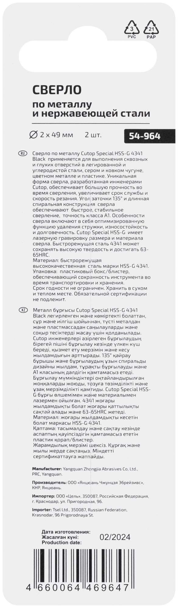Сверло по металлу Cutop Special, HSS-G, 2 х 49/21 мм (2 шт)