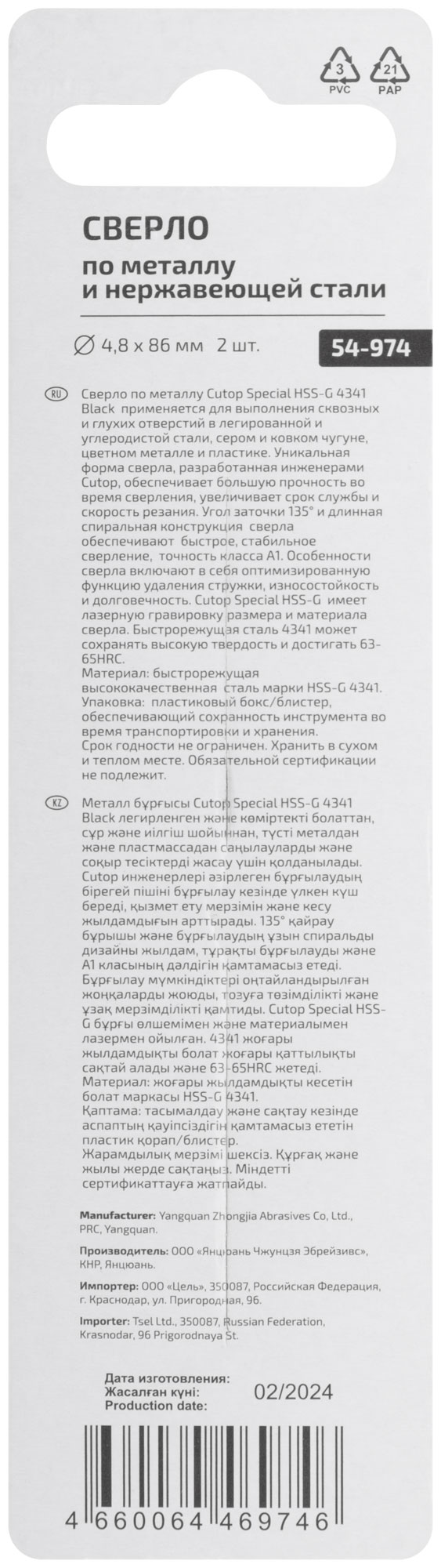 Сверло по металлу Cutop Special, HSS-G, 4,8 х 86/46 мм (2 шт)