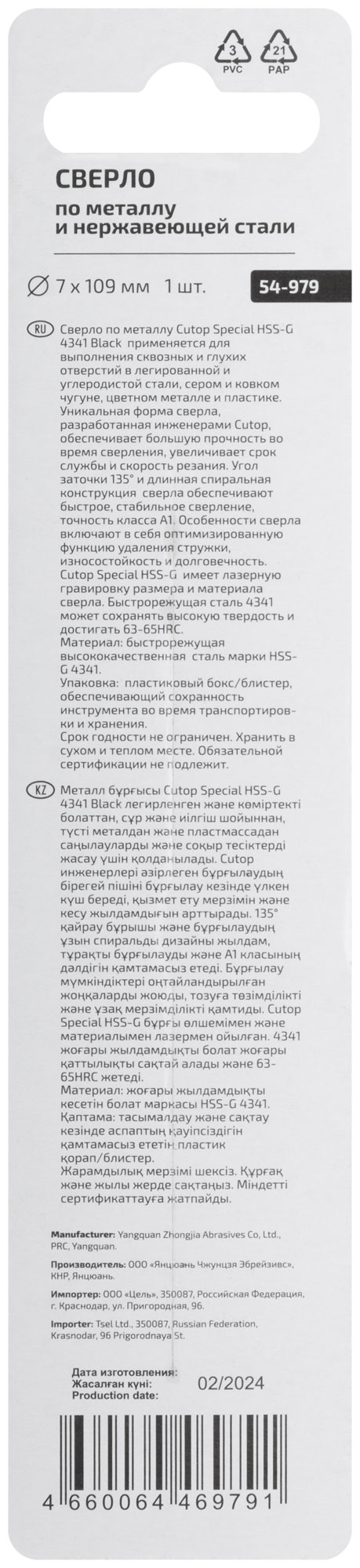 Сверло по металлу Cutop Special, HSS-G, 7 х 109/62 мм (1 шт)