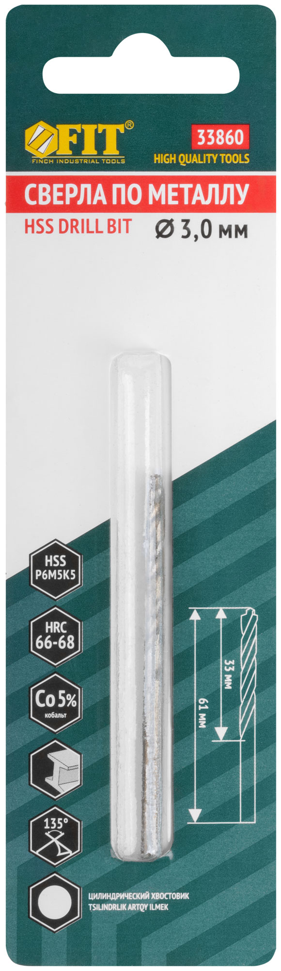 Сверло по металлу HSS, кобальт 5% Профи, ступенчатая заточка наконечника, блистер 3,0х61 мм ( 1 шт.)