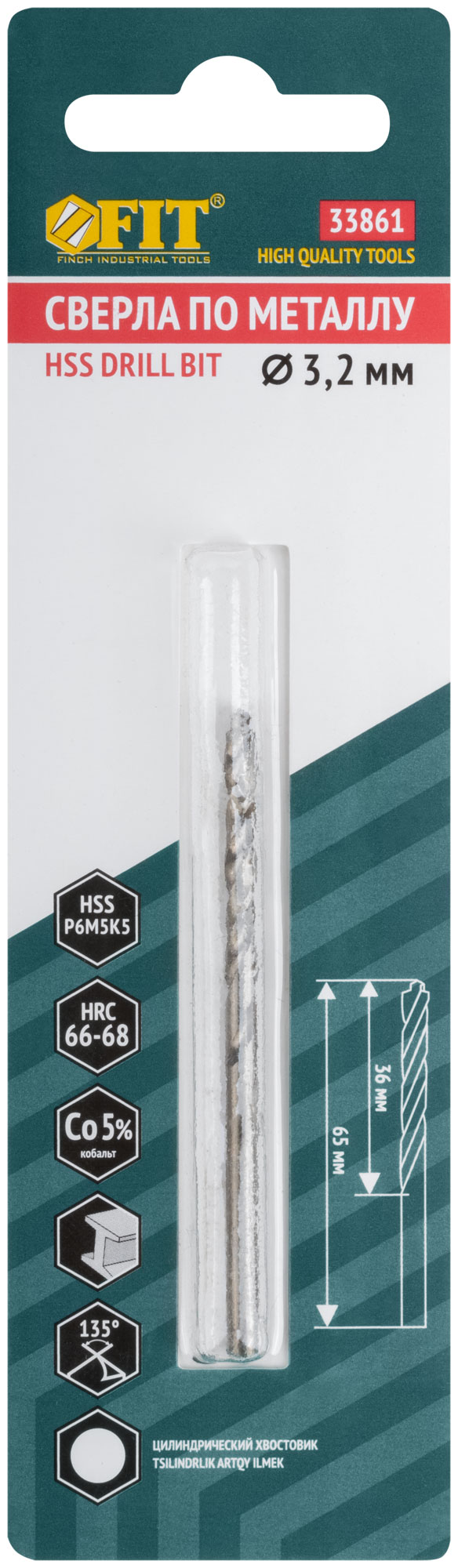 Сверло по металлу HSS, кобальт 5% Профи, ступенчатая заточка наконечника, блистер 3,2х65 мм ( 1 шт.)