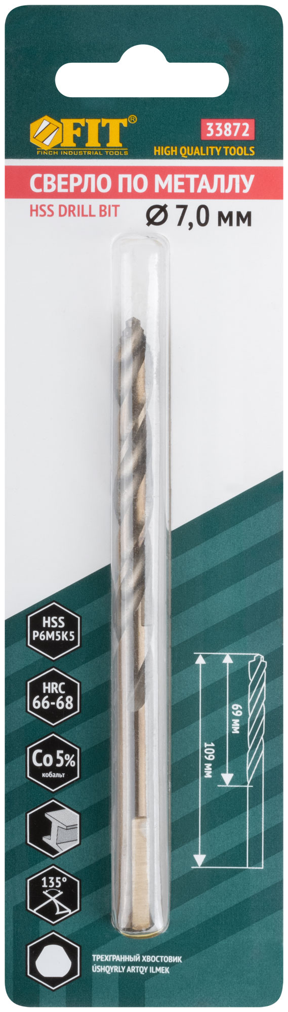 Сверло по металлу HSS, кобальт 5% Профи, ступенчатая заточка наконечника, блистер 7,0х109 мм ( 1 шт.)