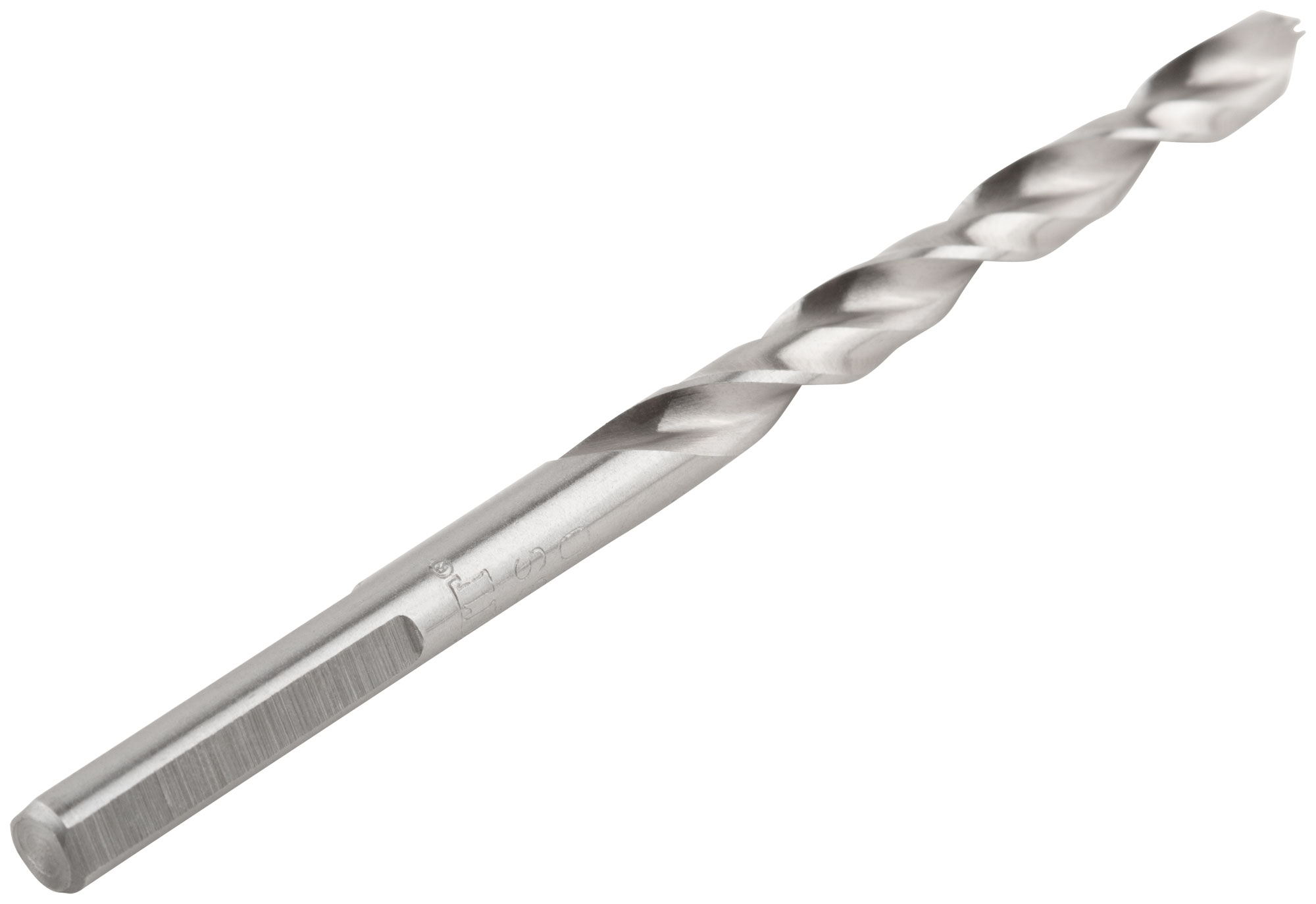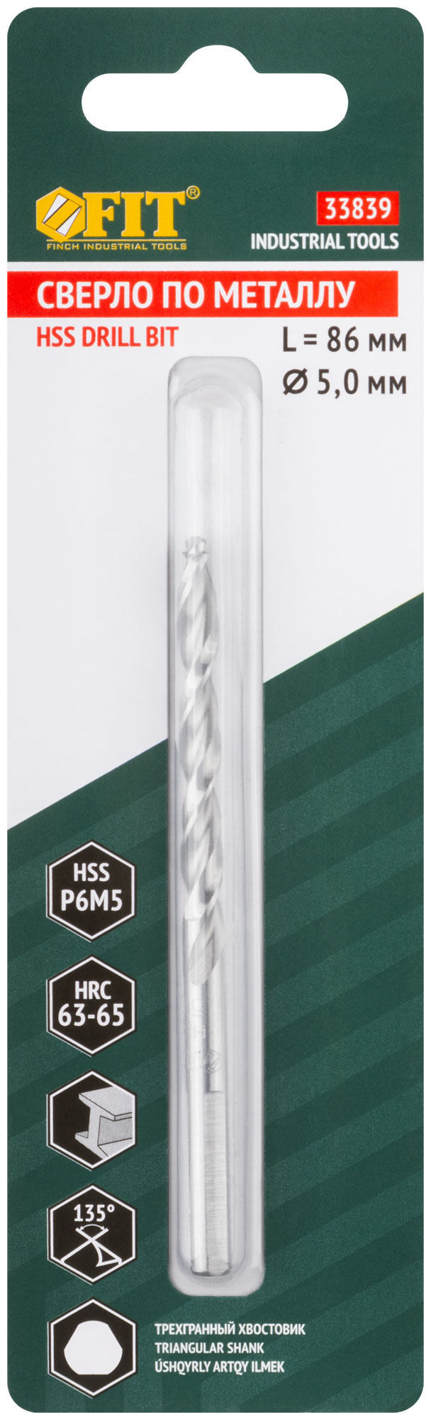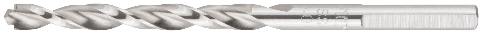 DIN 338. 33831-33834 - цилиндрический хвостовик, 33835-33848 - трехгранный хвостовик. Полированное. C двухплоскостной заточкой. Центровочный наконечник позволяет сверлить без предварительного кернения. Класс точности А1. Угол заточки 135°. Материал: быстрорежущая (HSS) сталь Р6М5. Упаковка: блистер.
