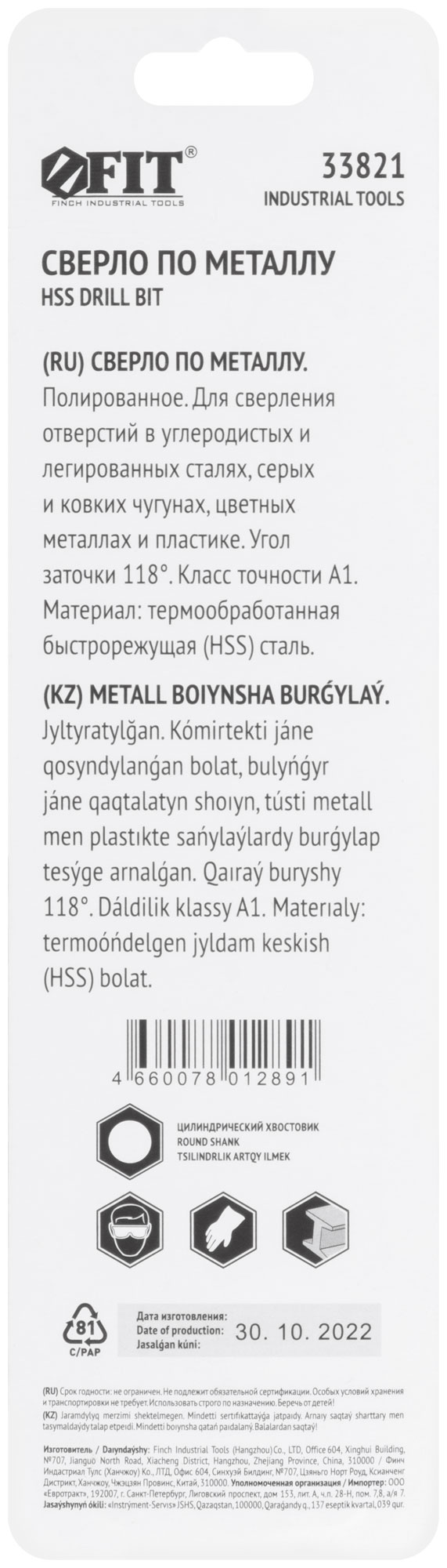 DIN 338. Цилиндрический хвостовик. Полированное. Угол заточки 118°. Класс точности А1. Материал: быстрорежущая (HSS) сталь. Упаковка: блистер.