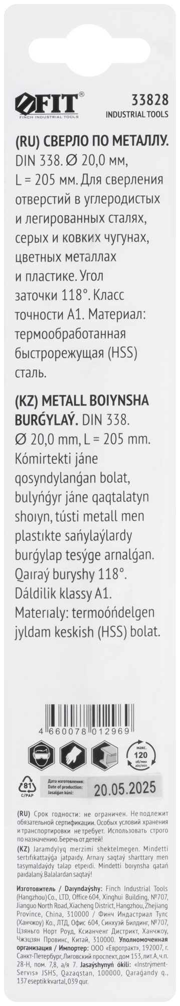 Сверло по металлу HSS полированное в блистере 20,0х205 мм ( 1 шт.)