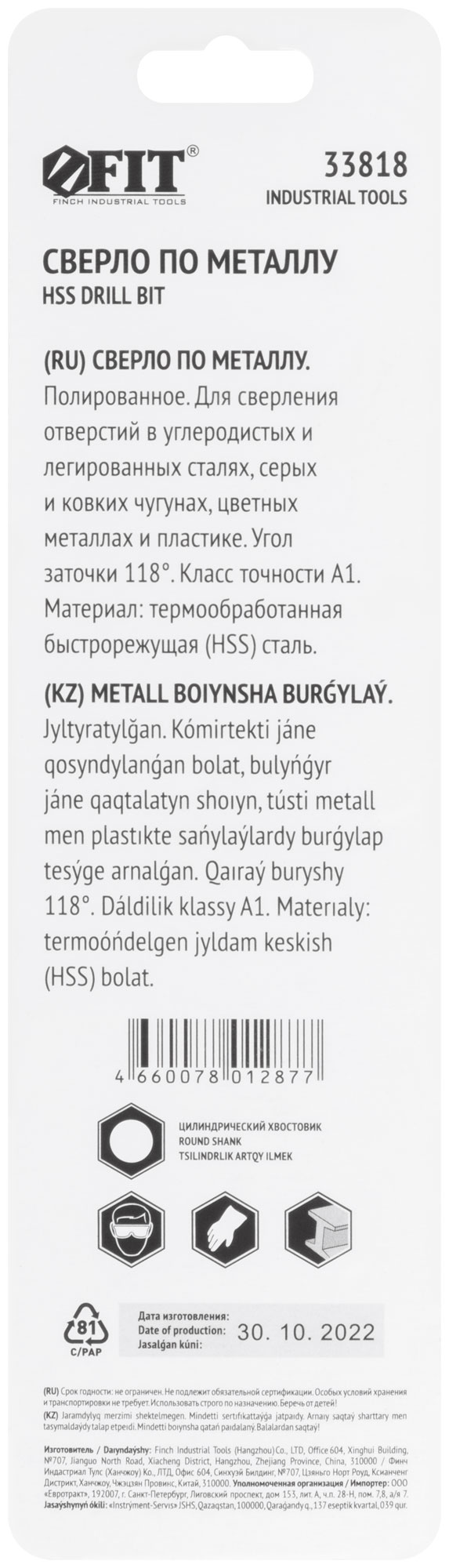DIN 338. Цилиндрический хвостовик. Полированное. Угол заточки 118°. Класс точности А1. Материал: быстрорежущая (HSS) сталь. Упаковка: блистер.