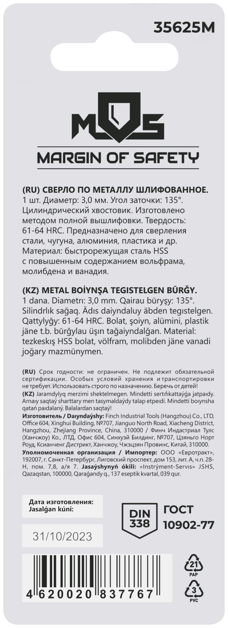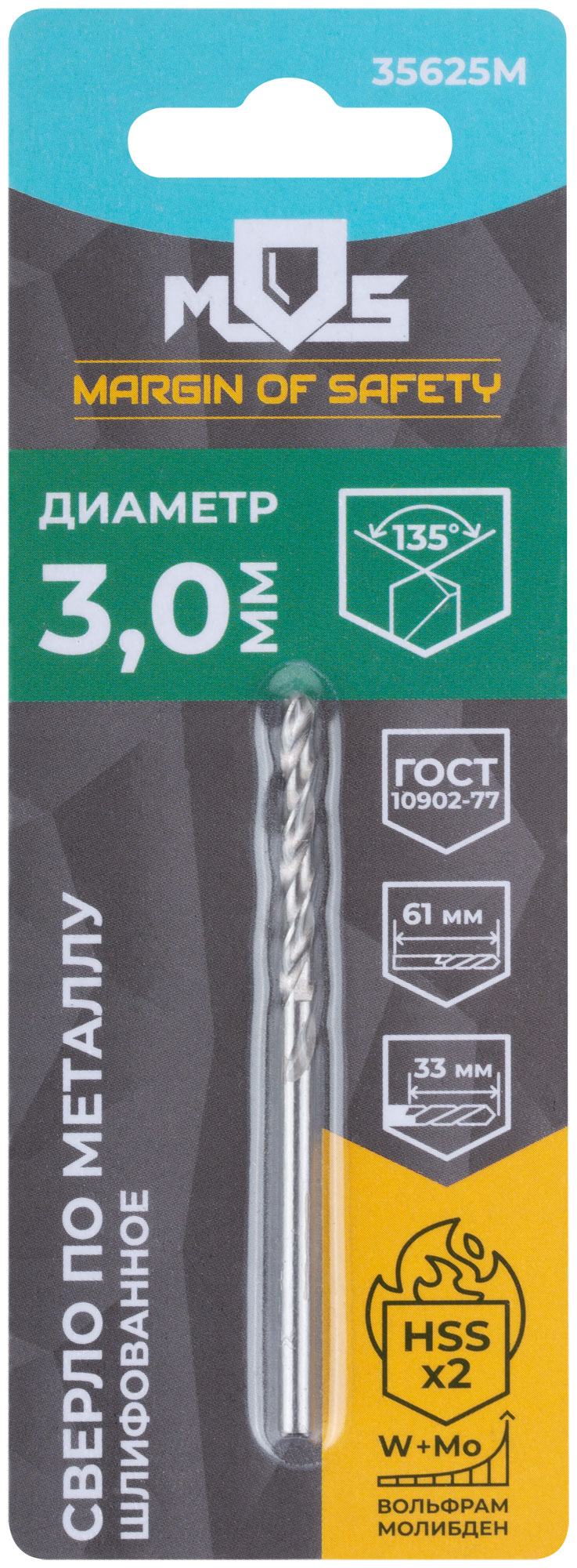 Сверло по металлу HSS шлифованное в блистере, угол заточки 135°, 3,0 x 61 мм (1 шт.)