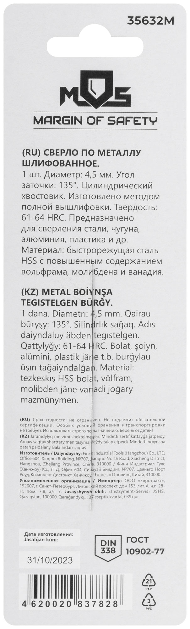 DIN338. Цилиндрический хвостовик. Изготовленно методом полной вышлифовки. Угол заточки 135°. Твердость: 61-64HRC. Материал: быстрорежущая сталь с повышенным содержанием вольфрама, молибдена и ванадия. Упаковка: блистер.