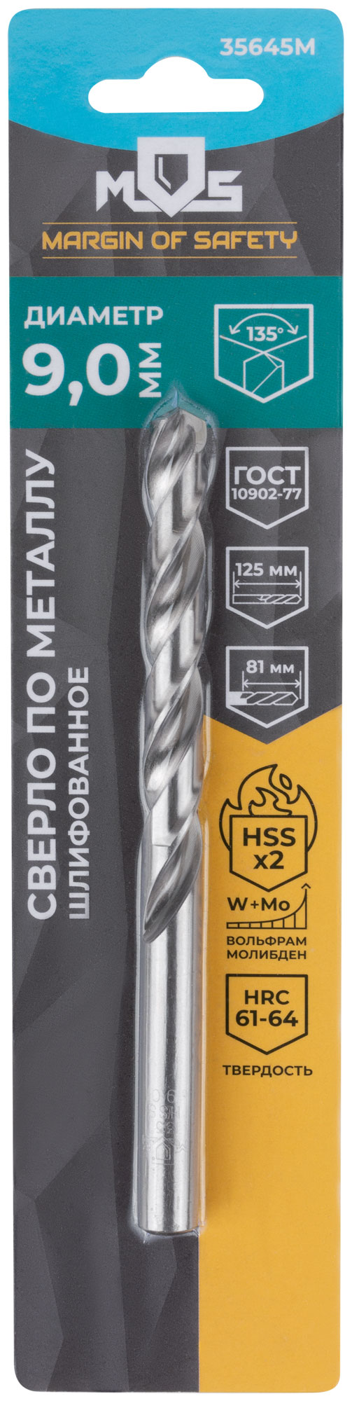 Сверло по металлу HSS шлифованное в блистере, угол заточки 135°, 9,0 x 125 мм (1 шт.)