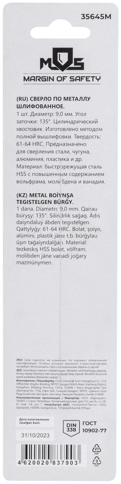 DIN338. Цилиндрический хвостовик. Изготовленно методом полной вышлифовки. Угол заточки 135°. Твердость: 61-64HRC. Материал: быстрорежущая сталь с повышенным содержанием вольфрама, молибдена и ванадия. Упаковка: блистер.