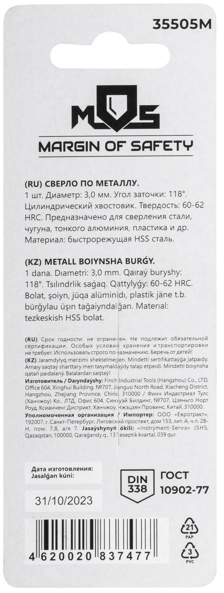 DIN338. Цилиндрический хвостовик. Шлифованная кромка. Угол заточки 118°. Твердость: 60-62HRC. Материал: быстрорежущая сталь HSS4241. Упаковка: блистер.