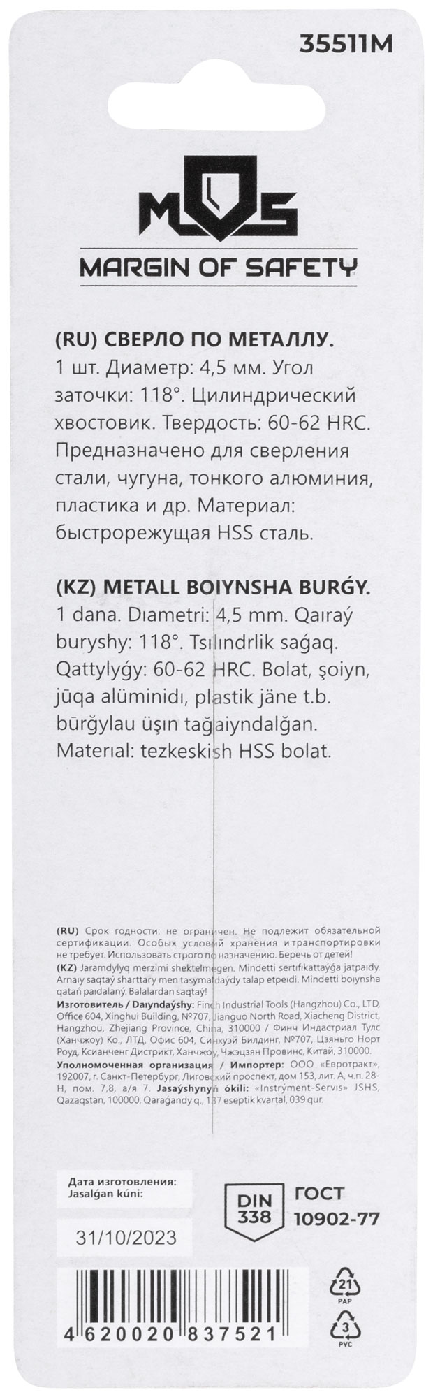 Сверло по металлу HSS в блистере, угол заточки 118°, 4,5 x 80 мм (1 шт.)