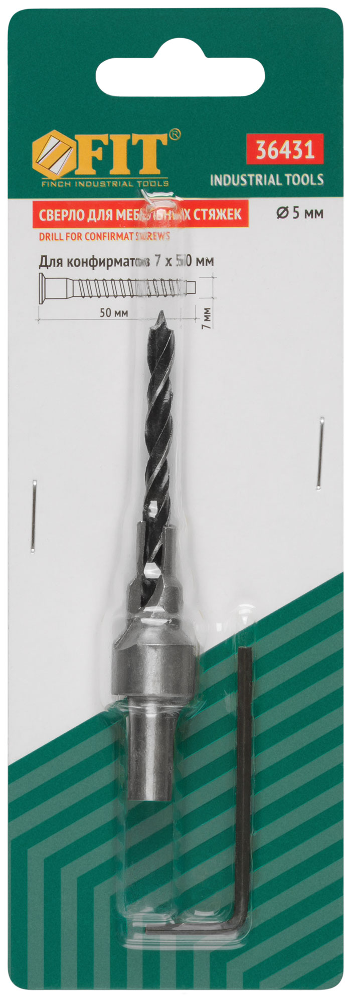 Для сверления отверстий в древесине под ме-бельную стяжку «конфирмат». В комплекте: сверло, держатель сверла с зенкером, ключ шестигранный. Материал: инструментальная сталь. Упаковка: блистер.