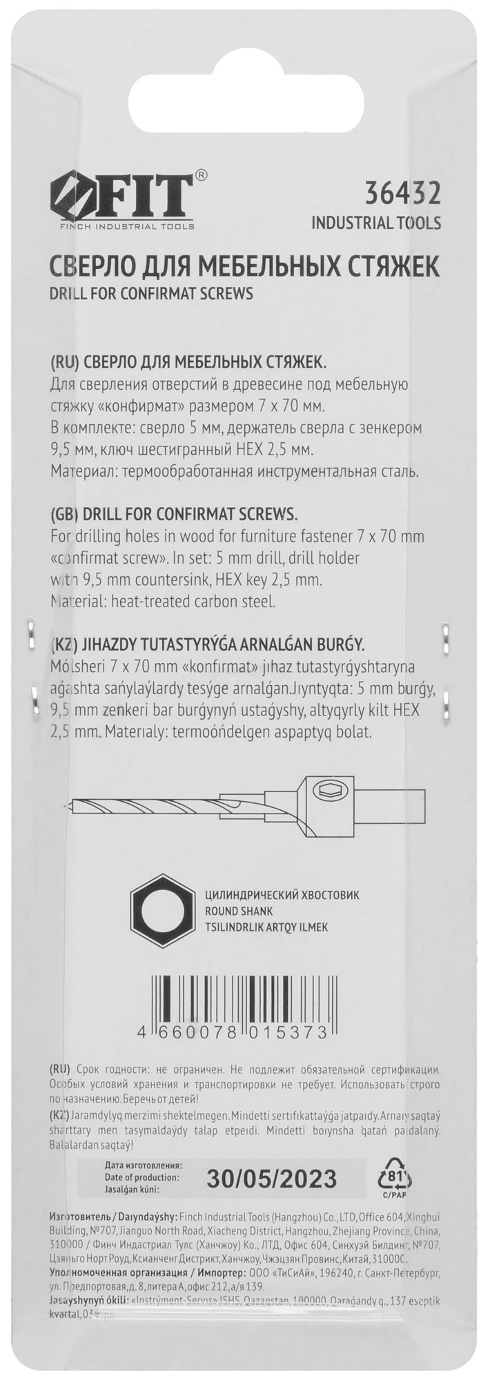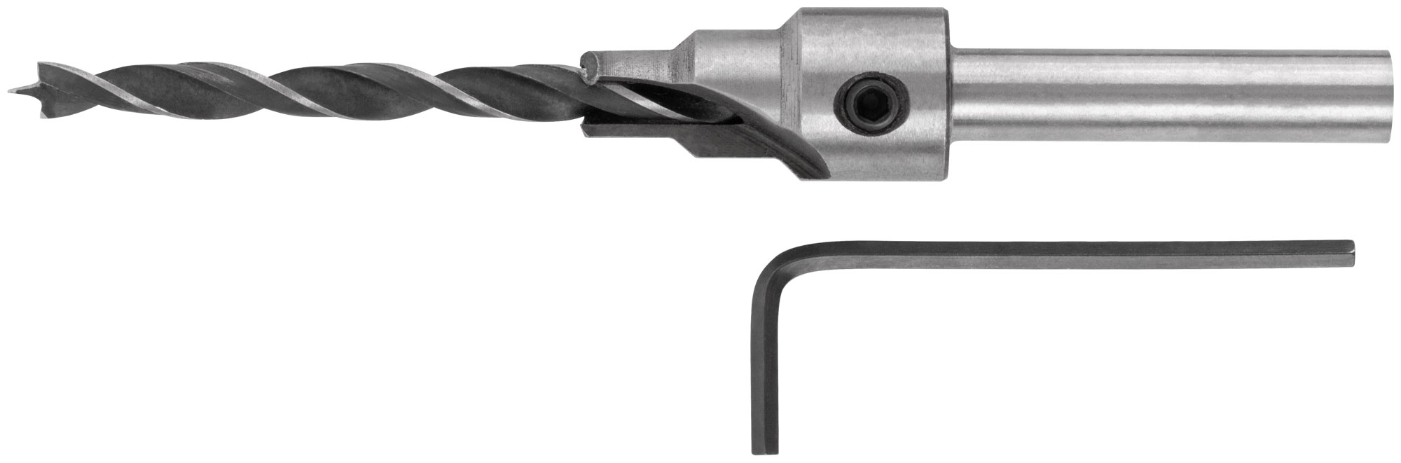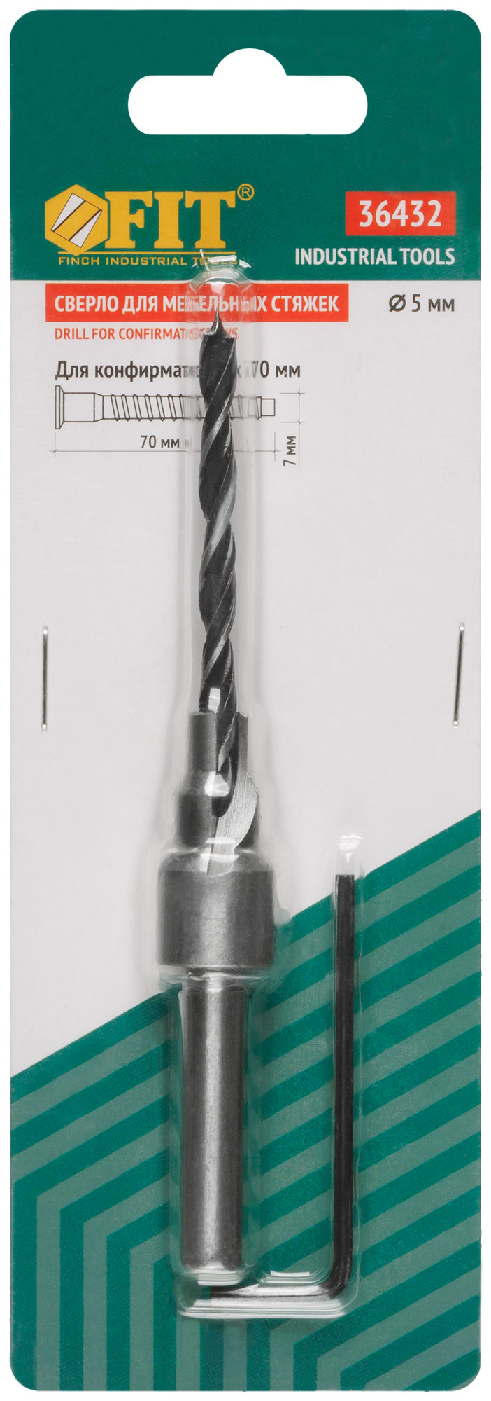Для сверления отверстий в древесине под ме-бельную стяжку «конфирмат». В комплекте: сверло, держатель сверла с зенкером, ключ шестигранный. Материал: инструментальная сталь. Упаковка: блистер.