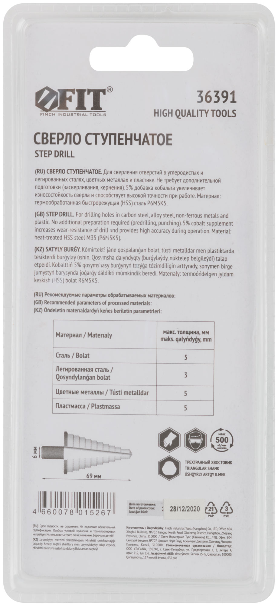 С добавлением кобальта 5%. Для сверления отверстий в листовом металле и пластике, а также рассверливания существующих отверстий. Трехгранный хвостовик. Материал: быстрорежущая (HSS) сталь Р6М5К5. Упаковка: двойной блистер