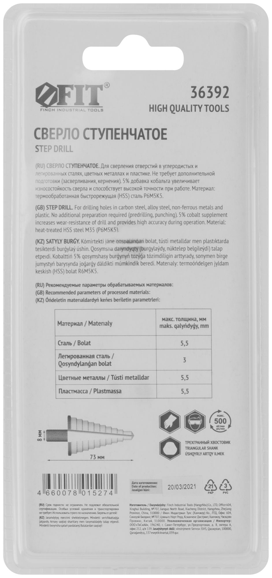 С добавлением кобальта 5%. Для сверления отверстий в листовом металле и пластике, а также рассверливания существующих отверстий. Трехгранный хвостовик. Материал: быстрорежущая (HSS) сталь Р6М5К5. Упаковка: двойной блистер
