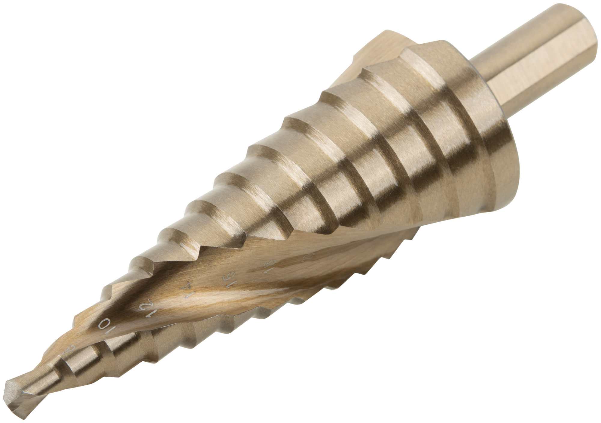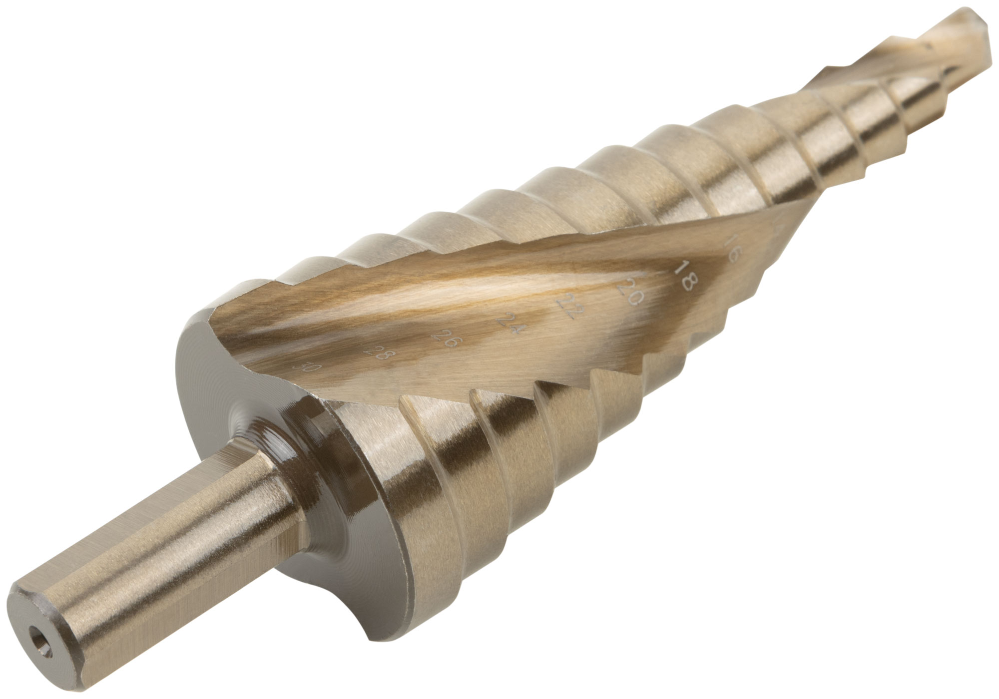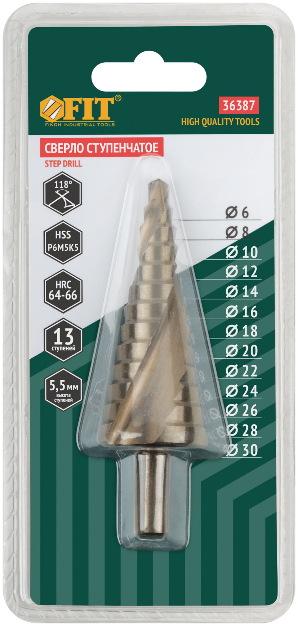 Сверло ступенчатое HSS Co5% ( Р6М5К5 ) по металлу, спиральный профиль, 13 ступеней, 6-30 мм
