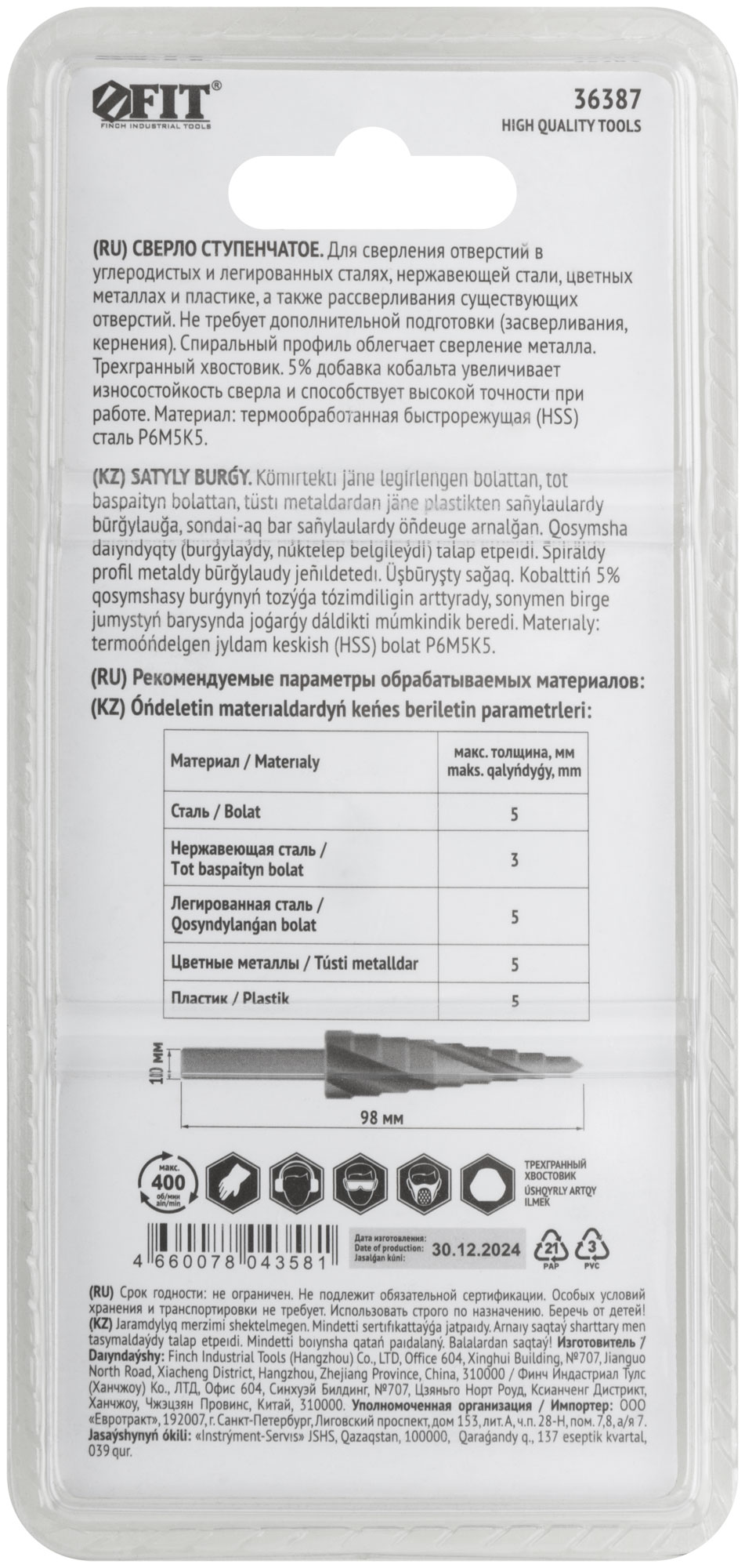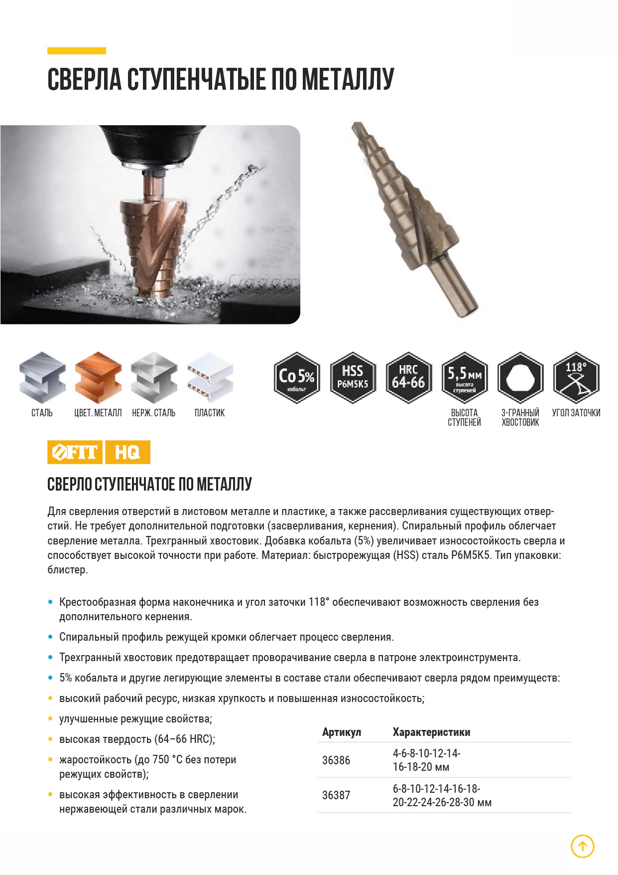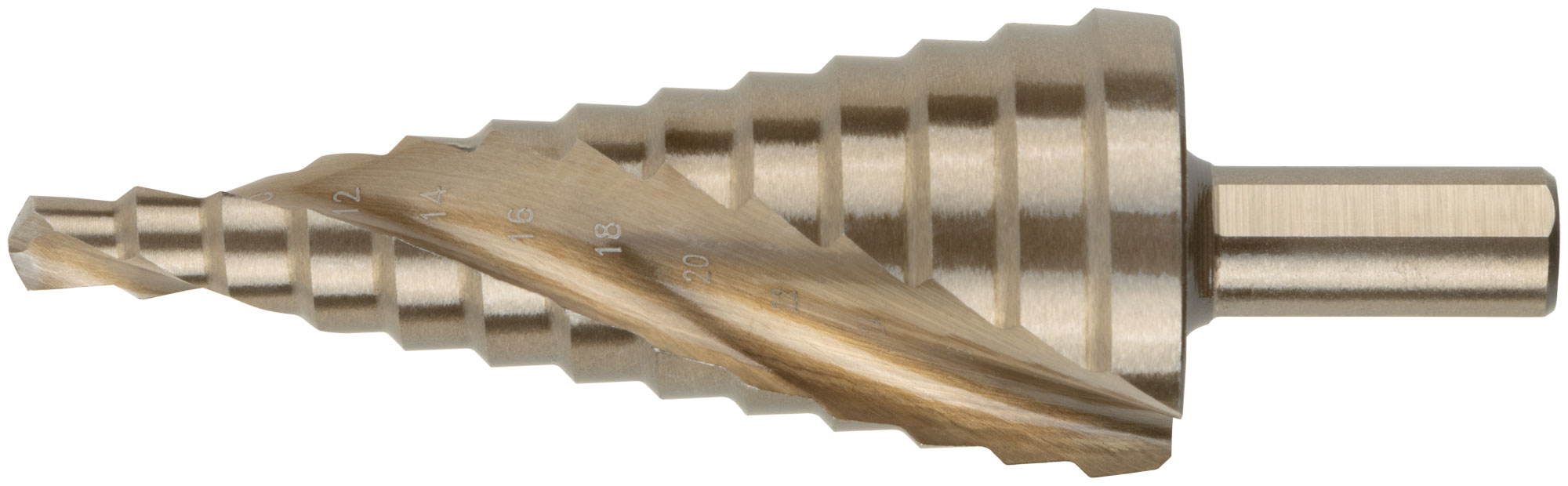 Сверло ступенчатое HSS Co5% ( Р6М5К5 ) по металлу, спиральный профиль, 13 ступеней, 6-30 мм