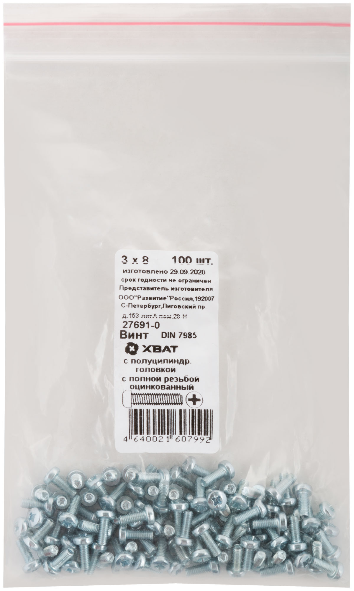 Винт с полуцилиндрич. головкой с полной резьбой оцинков. DIN 7985 3 х 8 100 шт. Фасовка