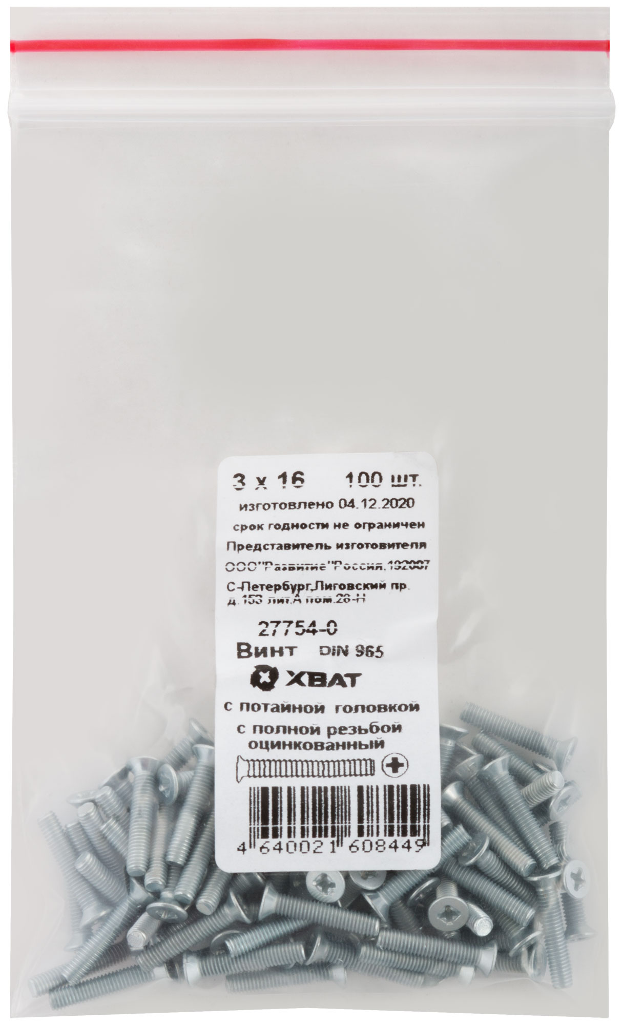 Винт с потайной головкой с полной резьбой оцинкованный DIN 965 3 х 16 100 шт. Фасовка