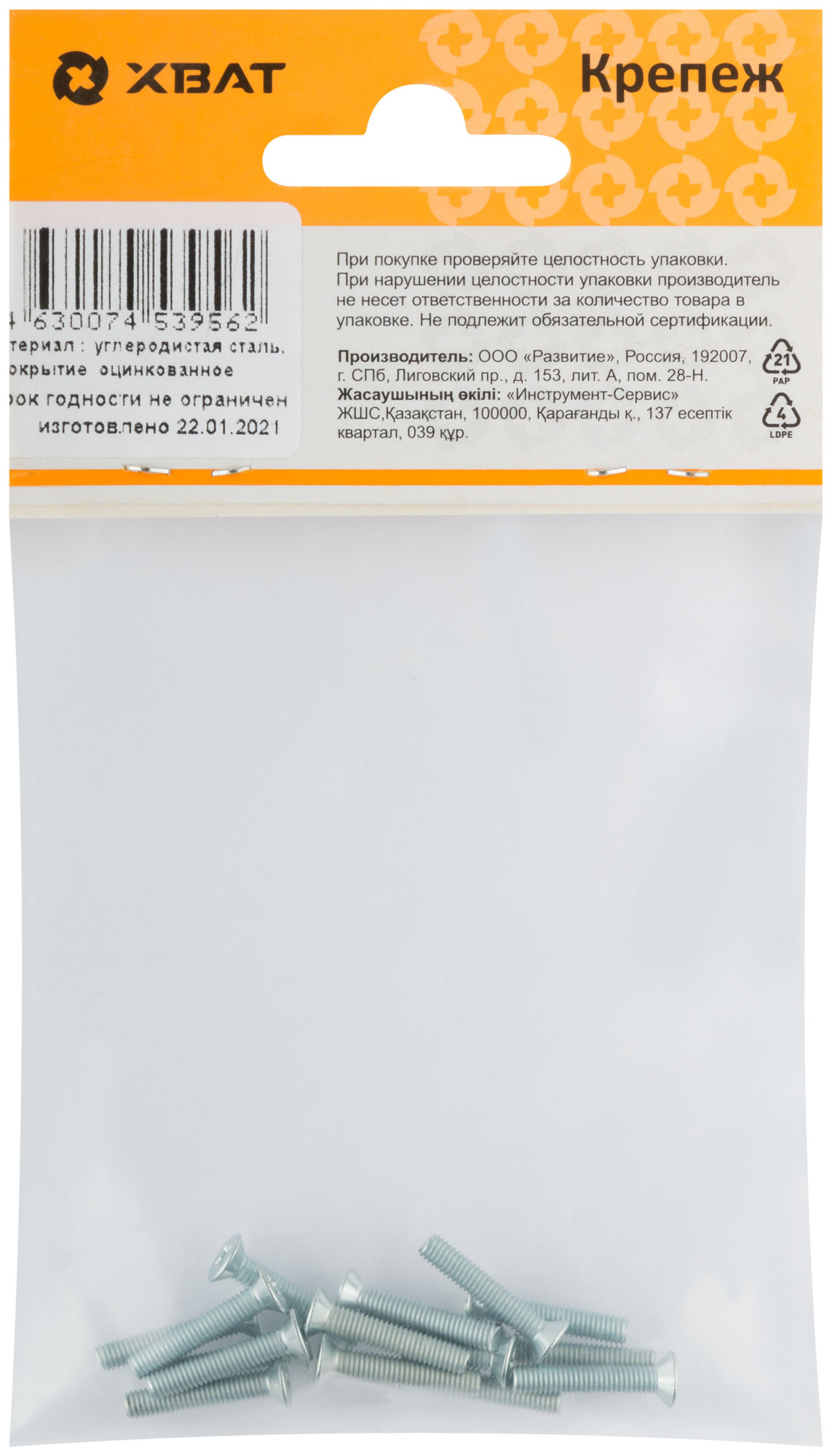 Винт с метрической резьбой и потайной головкой с крестообразным шлицем. Изготовлен из стали, оцинкован. Применяется для соединения элементов строительных материалов. Популярен при изготовлении и ремонте мебели. Класс прочности не ниже 4.8