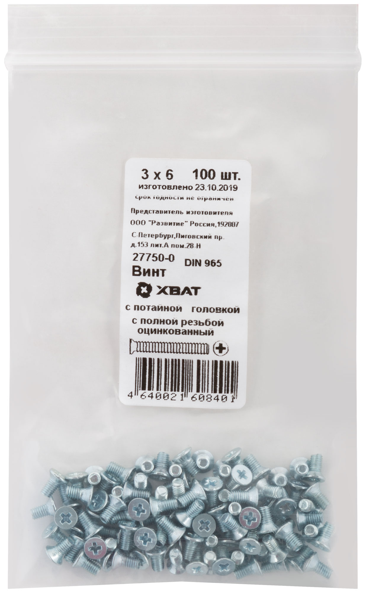 Винт с потайной головкой с полной резьбой оцинкованный DIN 965 3 х 6 100 шт. Фасовка