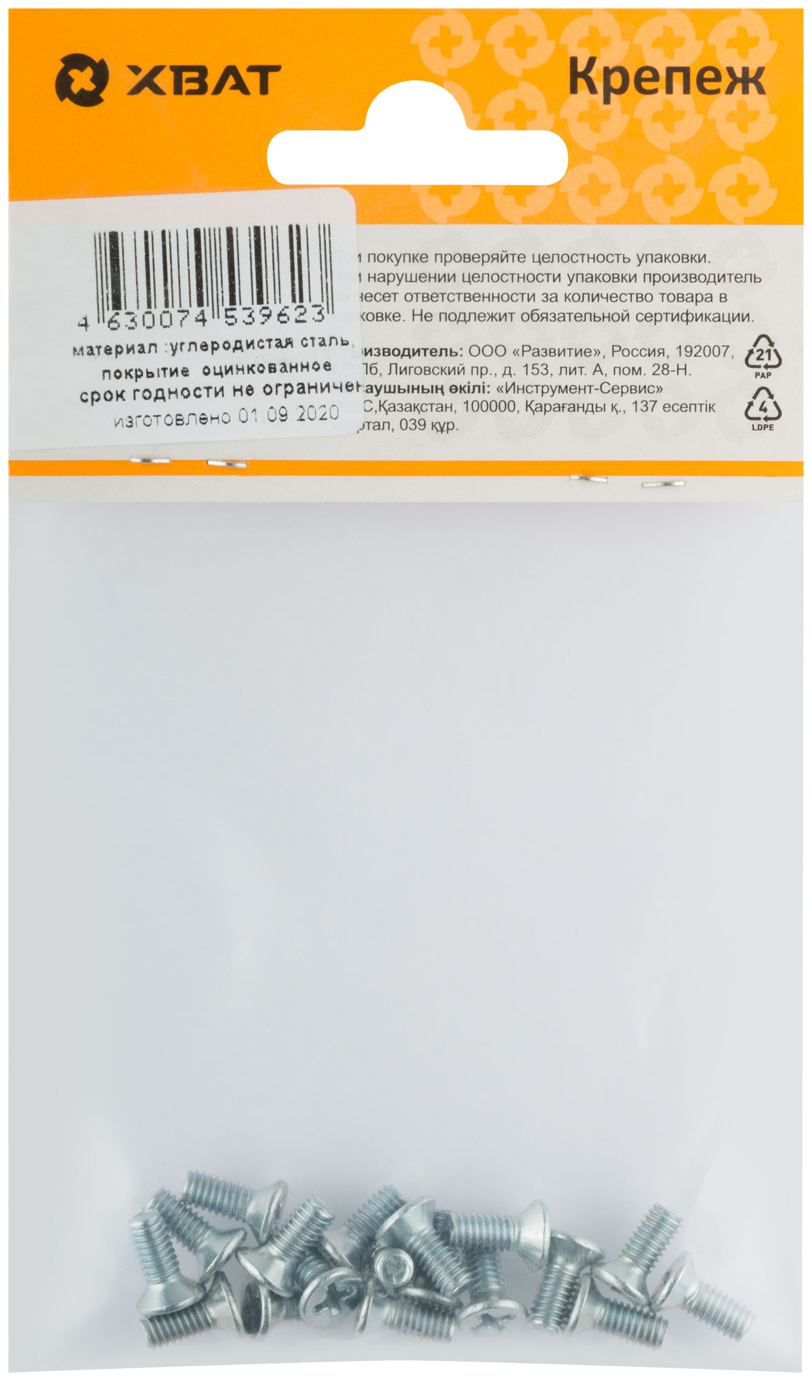 Винт с метрической резьбой и потайной головкой с крестообразным шлицем. Изготовлен из стали, оцинкован. Применяется для соединения элементов строительных материалов. Популярен при изготовлении и ремонте мебели. Класс прочности не ниже 4.8