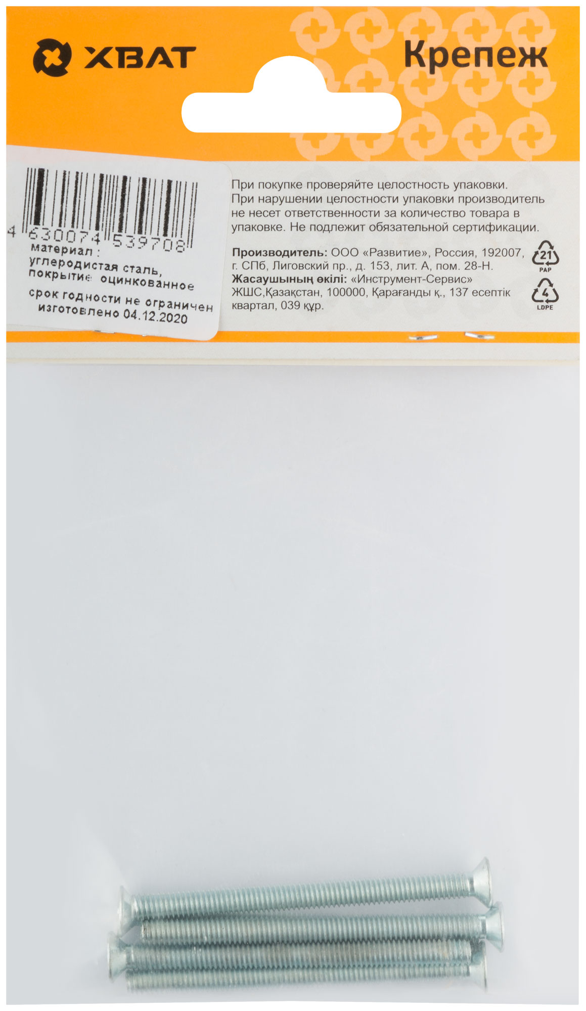 Винт с потайной головкой с полной резьбой оцинкованный DIN 965 4 х 50 (фасовка 5 шт.)