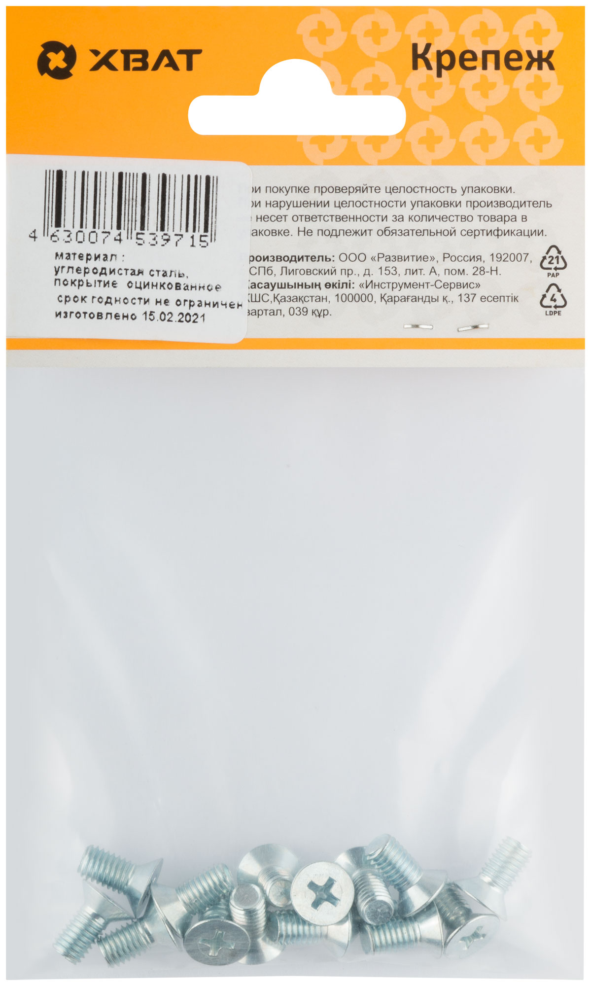 Винт с метрической резьбой и потайной головкой с крестообразным шлицем. Изготовлен из стали, оцинкован. Применяется для соединения элементов строительных материалов. Популярен при изготовлении и ремонте мебели. Класс прочности не ниже 4.8