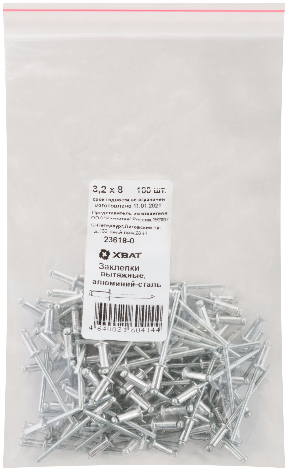 Заклепки вытяжные комбинированные, алюминий-сталь 3,2 х 8 100 шт. Фасовка