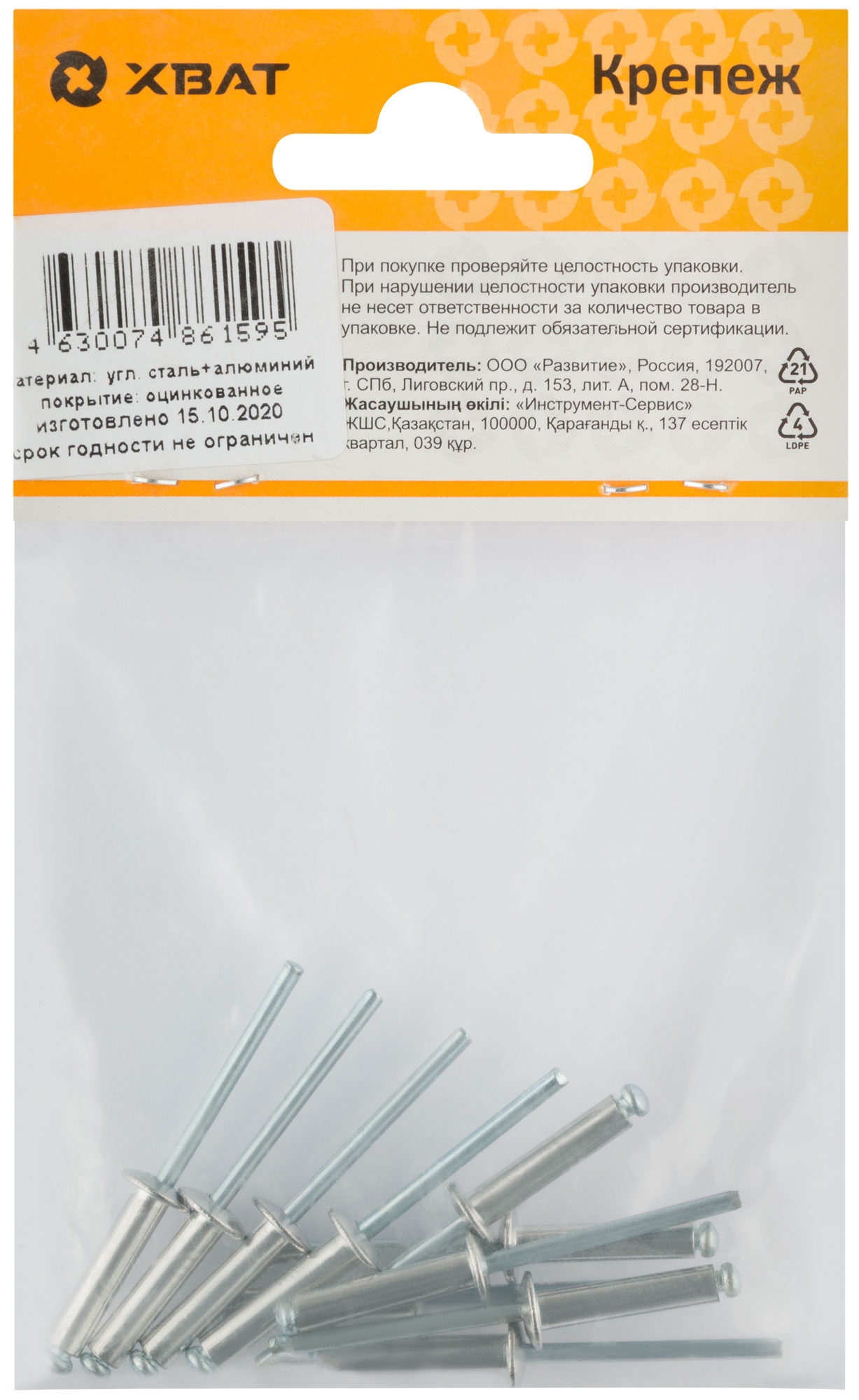 Заклепки вытяжные комбинированные, алюминий-сталь 4,0 х 18 (фасовка 10 шт.)