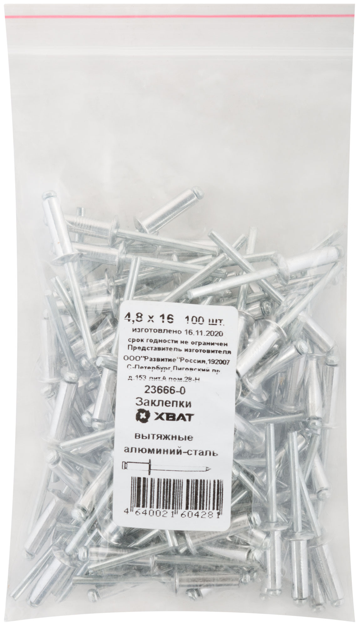 Заклепки вытяжные комбинированные, алюминий-сталь 4,8 х 16 100 шт. Фасовка