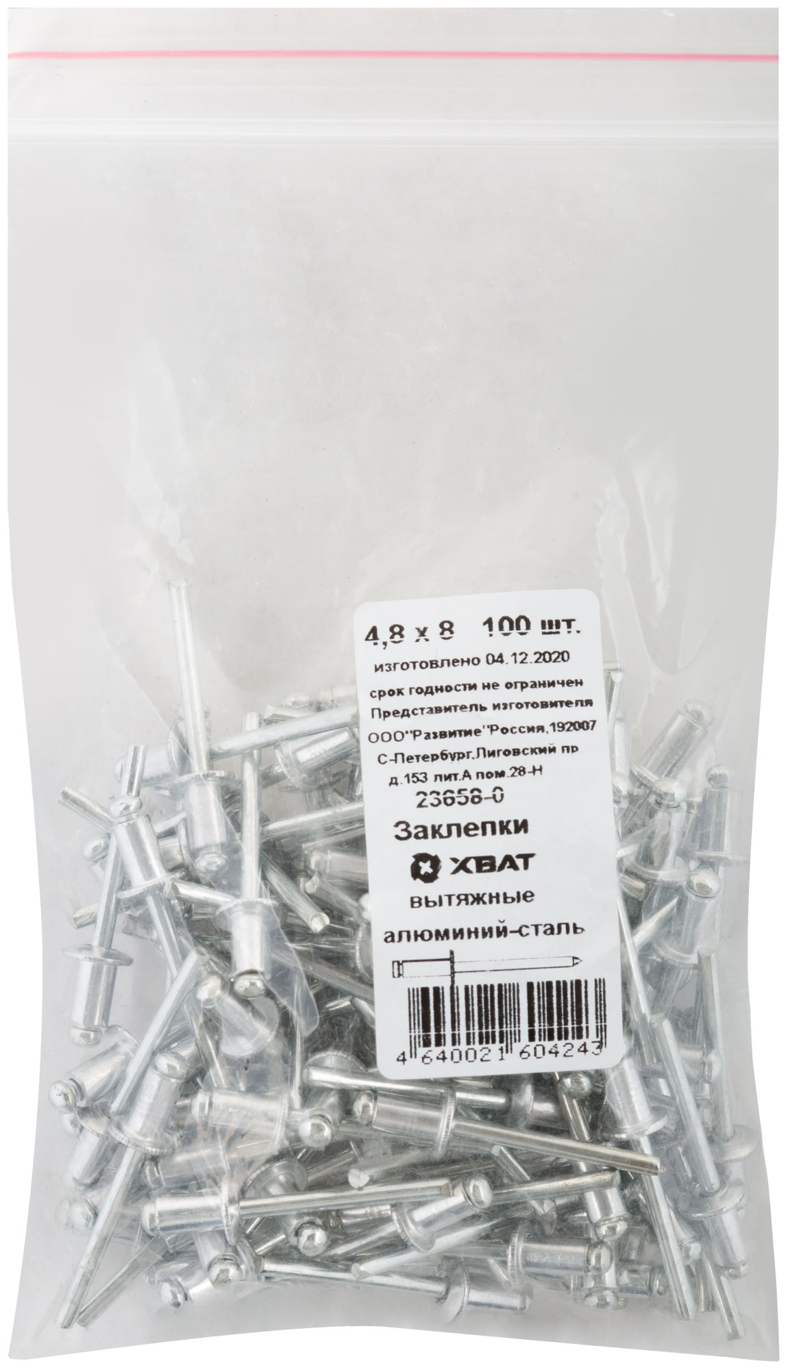 Заклепки вытяжные комбинированные, алюминий-сталь 4,8 х 8 100 шт. Фасовка